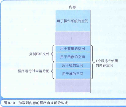 EXE文件中并不存在栈及堆的组。栈和堆需要的内存空间是在EXE文件加载到内存后开始运行时得到分配的。因而,内存中的程序,就是由用于变量的内存空间、用于函数的内存空间、用于栈的内存空间、用于堆的内存空间这4部分构成的。当然,在内存中,加载Windows 等操作系统的内存空间又是另外一回事了。