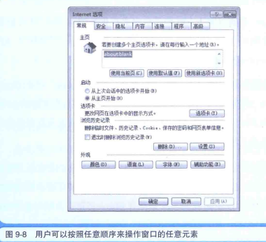 GUI之所以困难,是因为在GUI中用户按照怎样的顺序操作是无法确定的。例如,图 9-8 是 Web 浏览器(Internet Explorer 7)的一个窗口。通过多个标签页的切换,就可以进行各种项目设定。从 Web 浏览器的用户角度来说,这样的窗口不仅使用方便,操作也简单,但对负责开发的程序员来说,却决不是简单的事情。