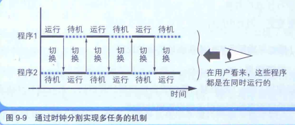 时钟分割指的是在短时间间隔内,多个程序切换运行的方式。在用户看来,就是多个程序在同时运行。也就是说,Windows 会自动切换多个程序的运行(图9-9)。此外,Windows 中还具有以程序中的函数为单位来进行时钟分割的多线程”功能。