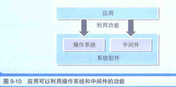 Windows 中,网络功能是作为标准功能提供的。数据库(数据库服务器)功能有时也会在之后进行追加。网络功能和数据库功能,虽并不是操作系统本身不可欠缺的功能,但因为它们和操作系统很接近,所以被统称为中间件而不是应用。意思是处于操作系统和应用的中间(middle)。操作系统和中间件合在一起,也称为系统软件。应用不仅可以利用操作系统,也可以利用中间件的功能(图 9-10 )。