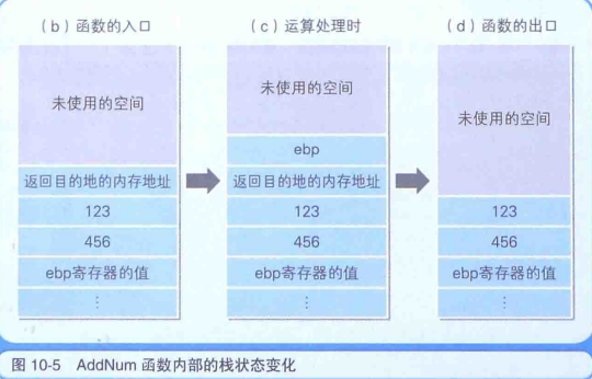 (6)中 ret 指令运行后,函数返回目的地的内存地址会自动出栈据此,程序流程就会跳转返回到代码清单 10-4 的(6)( Call AddNum的下一行)。这时,AddNum 函数人口和出口处栈的状态变化,就如图10-5 所示。将图 10-4和图 10-5 按照(a)(b)(c)(d)(e)(f)的顺序来看的话,函数调用处理时栈的状态变化就会很清楚了。由于(a状态时处理跳转到 AddNum 函数,因此(a)和(b)是同样的。同理在(d)状态时,处理跳转到了调用源,因此(d)和(e)是同样的。在f)状态时则进行了清理处理。栈的最高位的数据地址,是一直存储在esp 寄存器中的。