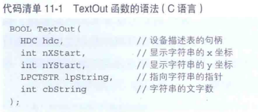 下面让我们来看一个利用系统调用来间接控制硬件的示例。例如,假设要在窗口中显示字符串,就可以使用 Windows API中的 TextOut 函数。TextOut 的语法如代码清单 11-1 所示。在这段代码中,确实没有能让大家意识到硬件的参数带有“设备描述表的句柄”这一注释的参数 hdc,是用来指定字符串及图形等绘制对象的识别值,表示的也不是直接硬件设备。