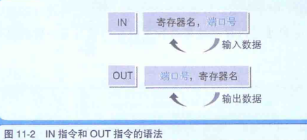 IN 指令和 OUT 指令的语法如图 11-2 所示。这是 Pentium 等x86系列 CPU用的IN指令和 OUT 指令的语法。IN 指令通过指定端口号的端口输人数据,并将其存储在 CPU 内部的寄存器中。OUT 指令则是把CPU 寄存器中存储的数据,输出到指定端口号的端口。