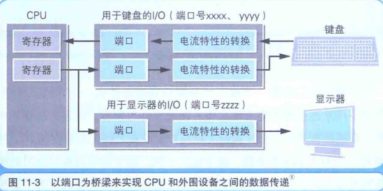 在实现 I/O 控制器功能的IC 中,会有多个端口。由于计算机中连接着很多外围设备,所以就会有多个 IO 控制器,当然也会有多个端口。一个 I/O 控制器既可以控制一个外围设备,也可以控制多个外围设备。各端口之间通过端口号进行区分。端口号也称为 I/O 地址IN 指令和 OUT 指令在端口号指定的端口和 CPU之间进行数据的输入输出。这和通过内存地址来进行主内存的读写是一样的道理(图11-3 )。
