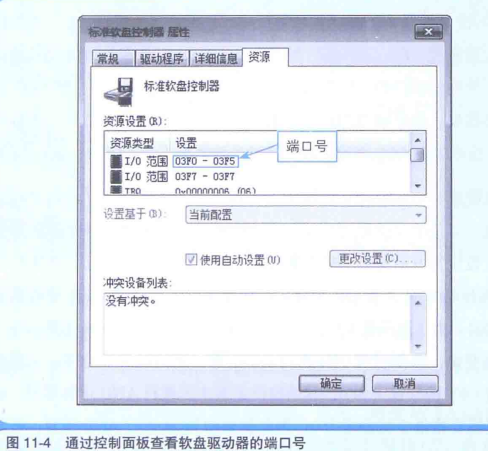 通过 Windows 的控制面板,我们可以查看外围设备所连接的 I/O控制器的端口号。图 11-4 是通过 Windows 控制面板来查看软盘驱动控制器的属性时的情况“。“I/O 的范围”右侧的数值就是端口号。通过指定该端口号,并利用IN/OUT 命令,就可以直接控制软驱这个硬件设备,实现输入输出处理了。