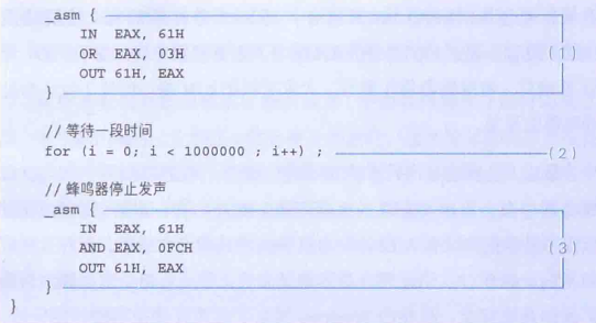 (3)部分是用来控制蜂鸣器发音停止的部分。首先,通过 INEAX,61H指令,把端口 61H 的数据存储到 CPU的 EAX 寄存器中。接下来,通过 AND EAX,OFCH 指令,把 EAX寄存器的低2位设定成OFF。最后,通过 OUT 61HEAX 指令,把寄存器 EAX 的内容输出到61 号端口,使蜂鸣器停止发音。大家可以把 61H 端口的低 2 位认为是蜂鸣器的开关。