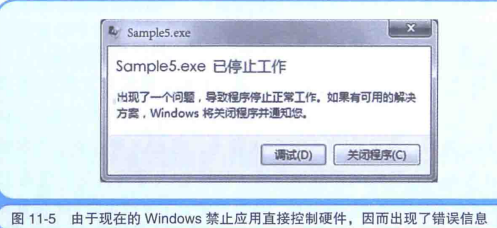 最后,让我们对代码清单 11-2 进行编译,并尝试运行一下。这时蜂鸣器应该会发出“嘀!”的短促声音。此外,有一点需要注意的是该程序虽然在旧版本 Windows (95、98)中可以正常运行,但在这以后的 Windows (XP、Vista 等)版本中是无法正常运行的。这是因为,为了保护系统安全,现在的 Windows 禁止了应用直接控制硬件的方式如果将该程序在最近的 Windows 版本上运行的话,就会出现如图 11-5所示的错误信息,而且蜂鸣器也不会发出声音。
