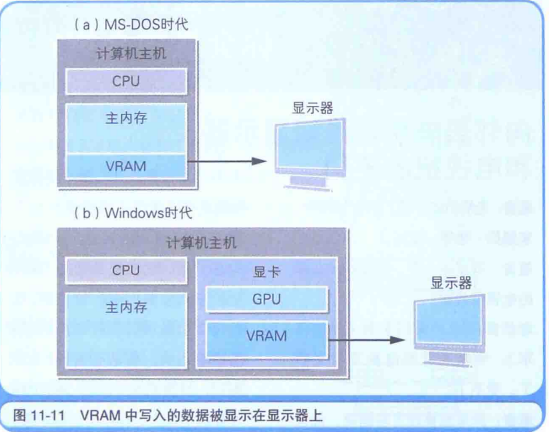 在现在的计算机中,显卡等专用硬件中一般都配置有与主内存相独立的 VRAM 和GPU(Graphics Processing Unit,图形处理器,也称为图形芯片 )。这是因为,对经常需要描绘图形的 Windows 来说,数百兆的 VRAM 是必需的。而为了提升图形的描绘速度,有时还需要专用的图形处理器(图 11-11(b))。但不管怎样,内存 VRAM 中存储的数据就是显示器上显示的信息,这一机制是不变的。