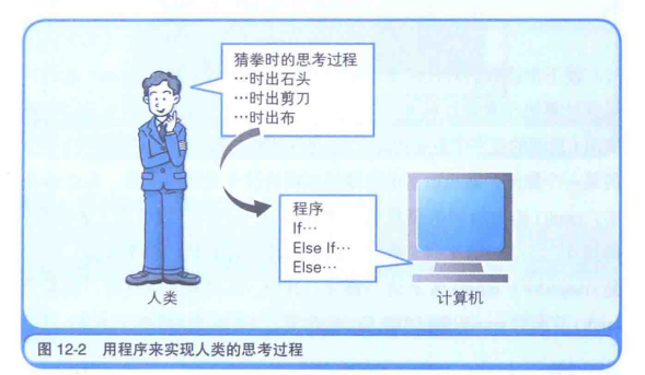 那么,如何才能让计算机思考呢?接下来,我们就一边用 C 语言制作《猜拳游戏》,一边来尝试各种思考方式。在猜拳游戏中,程序需要让计算机像猜拳选手一样来思考。因此,为了制作该游戏,就需要“用程序来实现猜拳选手的思考步骤”。请大家冷静地回忆一下自己在猜拳时的思考过程。如果这个思考过程能直接用程序来表现的话,那么就能实现让计算机思考了(图 12-2 )。