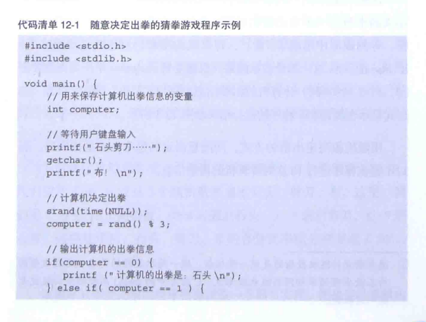 接下来让我们对代码清单12-1 的内容进行说明。computer 是用来保存计算机出拳数据的变量。石头、剪刀、布分别用数值 0、1、2来表示(后面的程序中也是如此)。这里使用随机数”来决定是 0、12中的某一个数值。随机数指的是随机出现的没有规律的数值。在 C 语言中,rand0) 函数返回的随机数的范围是 0~32767。该值用3 来取余得到 0、1、2 中的某一个数值。用该值作为计算机的出拳数据。也就是 computer = rand0% 3; 这一部分。其中,% 是取余运算符。而至于rand0前面的 srand(time(NULL)): 的功能,我们会在后面进行说明。