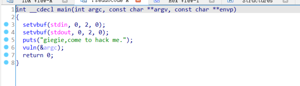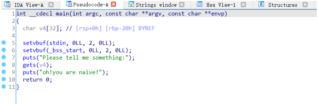 发现栈溢出漏洞,gets函数不限制输入的个数,会造成溢出