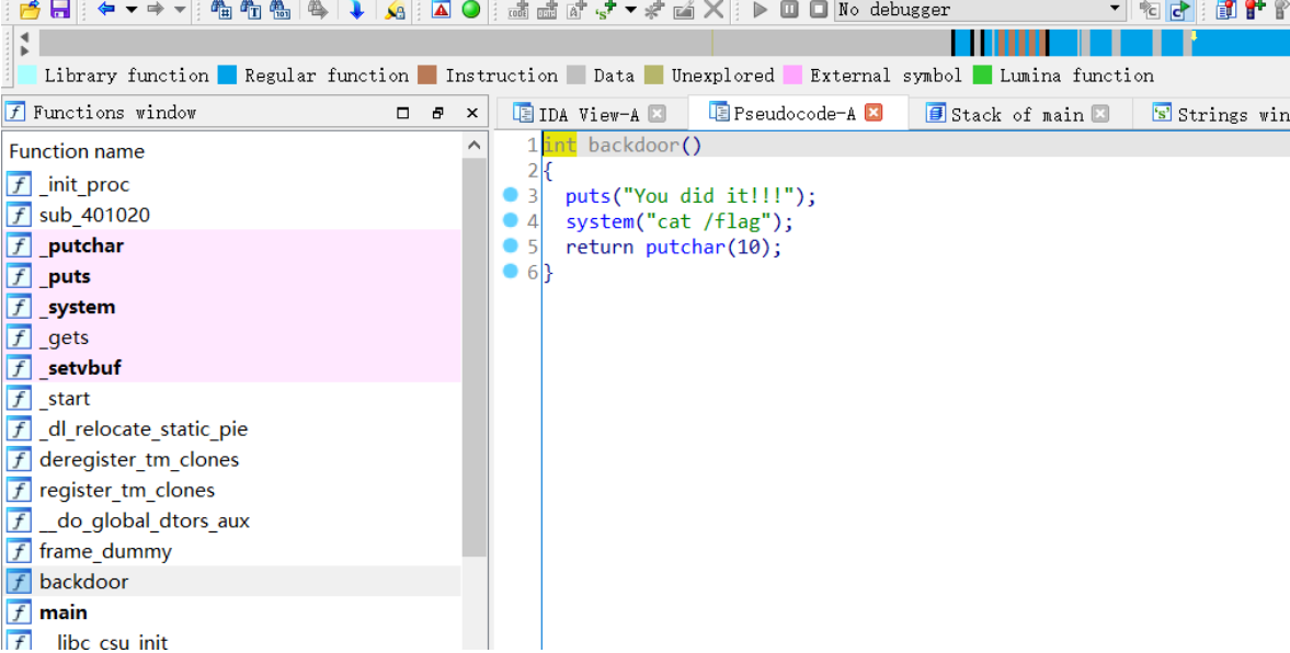 这里有个backdoor(),填入这个地址不会cat flag,我们需要直接找到cat flag 的 地址