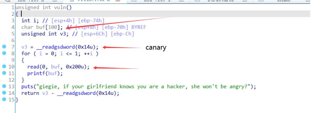 存在栈溢出,但需要泄露canary的值,我们看到有printf(buf),可以用来读取canary的值