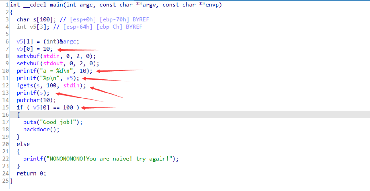 前两个printf函数输出了a的值,和v5的地址!我们就可以拿到v5的地址,然后利用格式化字符串漏洞将v5[0]的值改为100,拿到flag