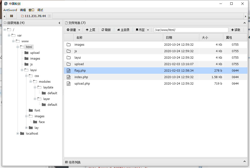 用蚁剑连接,在/var/www/html路径发现flag.php