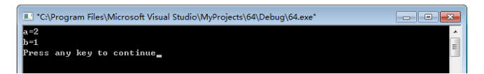 #include<stdio.h> main(){ int a=1; int b=2,c; c=a,a=b,b=c; printf("a=%d\nb=%d\n",a,b); }