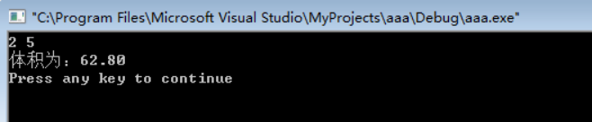 #include<stdio.h> #define PI 3.14 main() { float h,r,v; scanf("%f%fd",&r,&h); v=PI*r*r*h; printf("体积为:%.2f\n",v); }