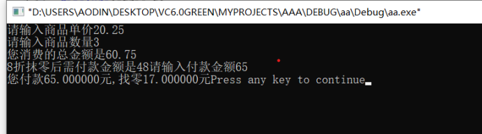 #include<stdio.h> main() { double a,b,c,d; int e,f; printf("请输入商品单价"); scanf("%lf",&a); printf("请输入商品数量"); scanf("%d",&e); b=a*e; printf("您消费的总金额是%.2lf\n",b); f=(int)(b*0.8); printf("8折抹零后需付款金额是%d",f); printf("请输入付款金额"); scanf("%lf",&c); d=c-f; printf("您付款%lf元,找零%lf元",c,d); }
