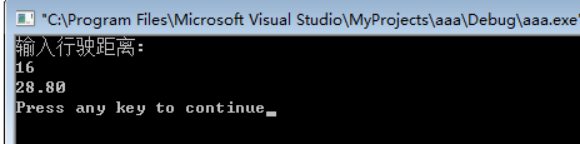 #include<stdio.h> main() { float s,l; printf("输入行驶距离:\n"); scanf("%f",&l); if(l<=3) s=8; else s=(l-3)*1.6+8; printf("%.2f\n",s);