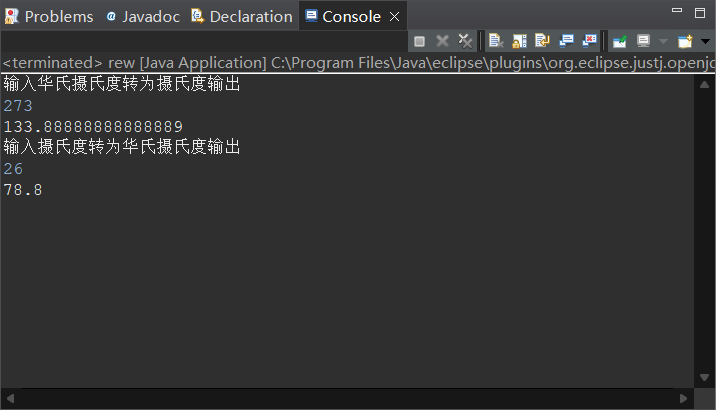 package jkl; import java.util.Scanner; public class rew { public static void main(String[] args) { var scanner =new Scanner(System.in); System.out.println("输入华氏摄氏度转为摄氏度输出"); double a=scanner.nextDouble(); double S=((a-32)*5)/9; System.out.println(S); System.out.println("输入摄氏度转为华氏摄氏度输出"); double b=scanner.nextDouble(); double V=b*9/5+32; System.out.println(V); } }