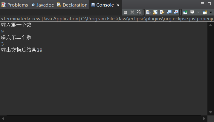 package jkl; import java.util.Scanner; public class rew { public static void main(String[] args) { var scanner =new Scanner(System.in); System.out.println("输入第一个数"); int a=scanner.nextInt(); System.out.println("输入第二个数"); int b=scanner.nextInt(); int c; c=a; a=b; b=c; System.out.println("输出交换后结果"+a +b); } }