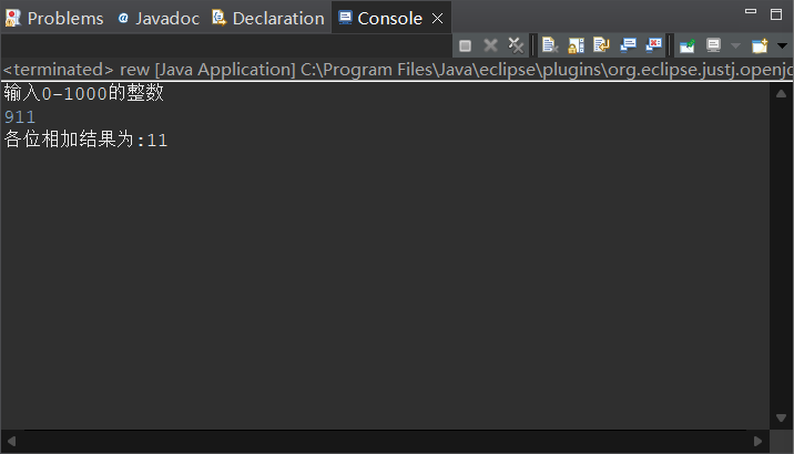package jkl; import java.util.Scanner; public class rew { public static void main(String[] args) { var scanner =new Scanner(System.in); System.out.println("输入0-1000的整数"); int a=scanner.nextInt(); int b; int c=a/100%10; int d=a/10%10; int e=a%10; int f=c+d+e; if(a>=1000) { b=1; System.out.println("各位相加结果为:"+b); } else { System.out.println("各位相加结果为:"+f); } } }