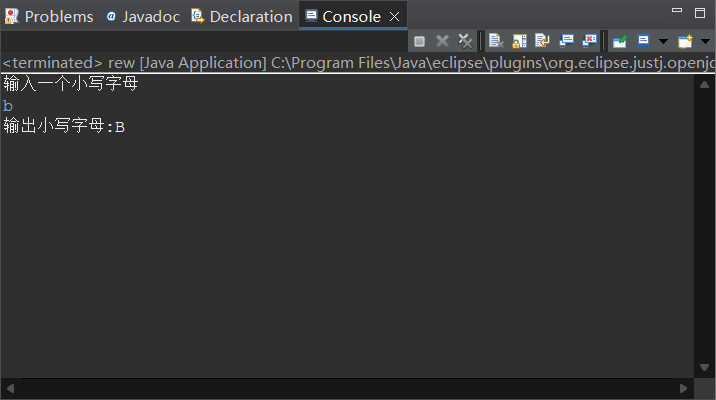 package jkl; import java.util.Scanner; public class rew { public static void main(String[] args) { var scanner =new Scanner(System.in); System.out.println("输入一个小写字母"); char a=scanner.next().charAt(0); char b=(char)((int)(a)-32); System.out.println("输出小写字母:"+b); } }