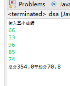package das; import java.util.Scanner; public class dsa { public static void main(String[] args) { Scanner input=new Scanner(System.in); double a[]=new double[5]; double sum=0; System.out.println("输入五个成绩"); for (int i = 0; i < a.length; i++) { a[i]=input.nextInt(); sum+=a[i]; } double jun=sum/5; System.out.println("总分"+sum+"平均分"+jun); } }
