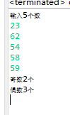 package das; import java.util.Scanner; public class dsa { public static void main(String[] args) { Scanner input=new Scanner(System.in); int a[]=new int[5]; int c=0,b=0; System.out.println("输入5个数"); for (int i = 0; i < a.length; i++) { a[i]=input.nextInt(); } for (int i = 0; i < a.length; i++) { if (a[i]%2==0) { b++; }else { c++; } } System.out.println("奇数"+c+"个"); System.out.println("偶数"+b+"个"); } }