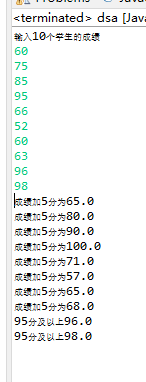 package das; import java.util.Random; import java.util.Scanner; public class dsa { public static void main(String[] args) { Scanner input=new Scanner(System.in); Random b=new Random(); double a[]=new double[10]; System.out.println("输入10个学生的成绩"); for (int i = 0; i < a.length; i++) { a[i]=input.nextDouble(); } for (int i = 0; i < a.length; i++) { if (a[i]+5<=100) { a[i]=a[i]+5; System.out.println("成绩加5分为"+a[i]); }else { System.out.println("95分及以上"+a[i]); } } } }