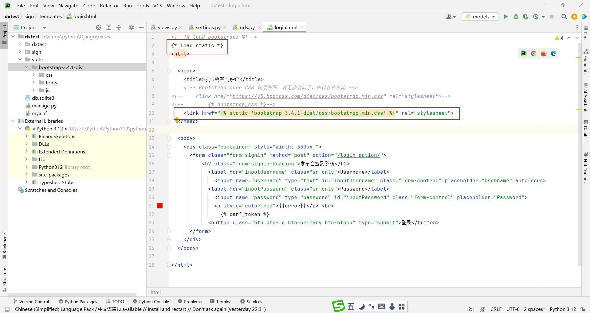 {% load static %} <link href="{% static 'bootstrap-3.4.1-dist/css/bootstrap.min.css' %}" rel="stylesheet">