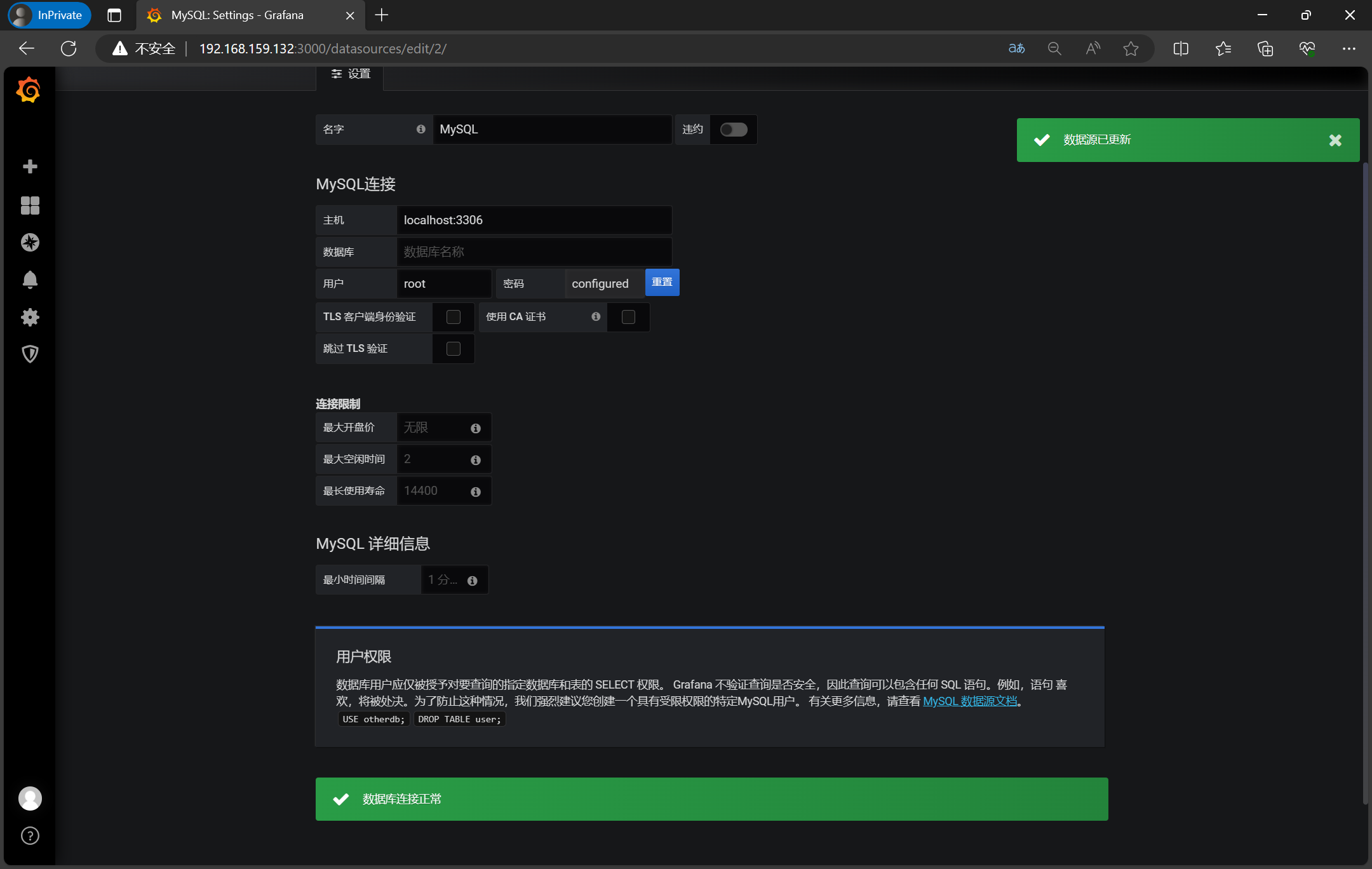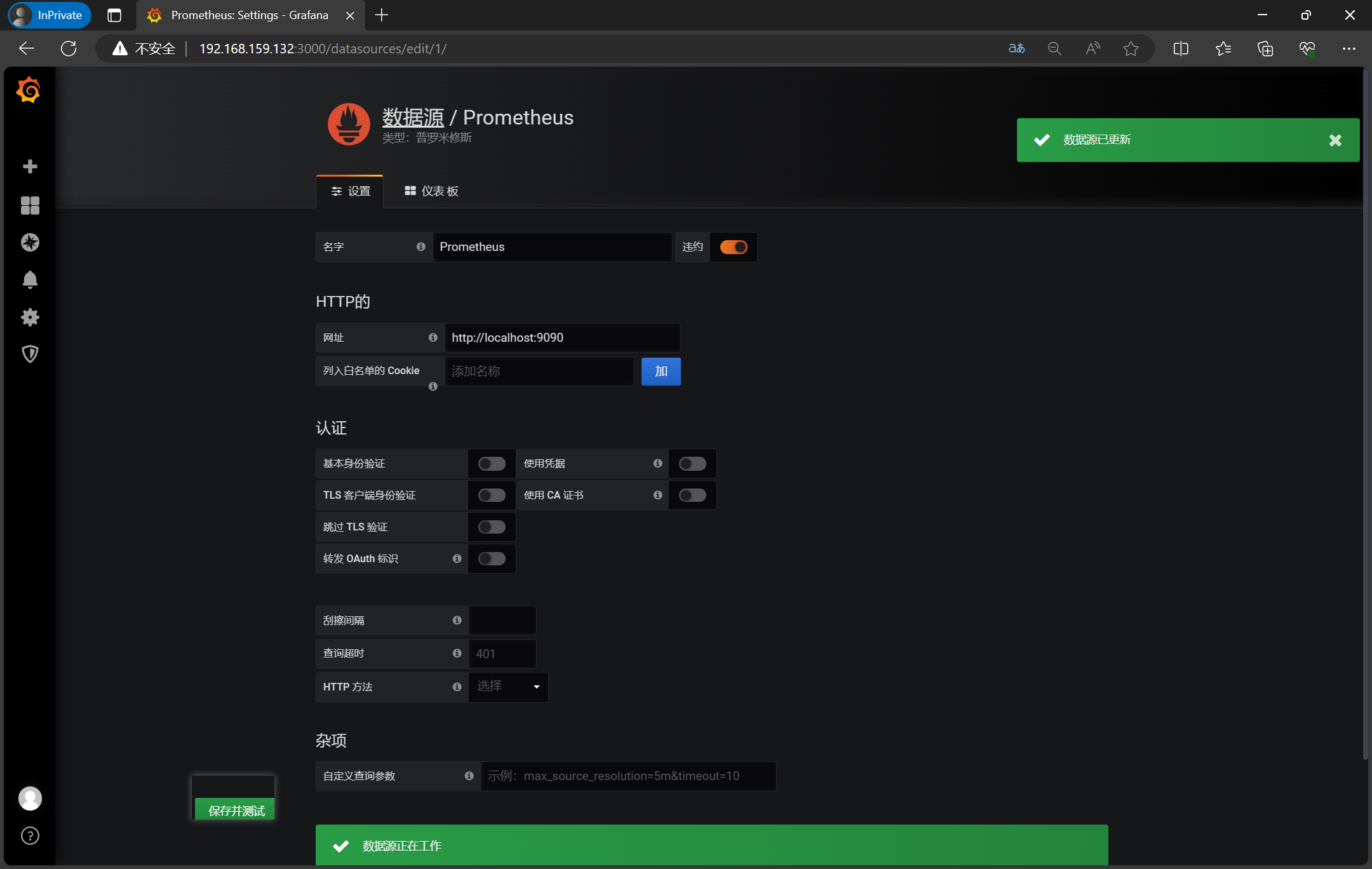 成功则表示grafana连接成功