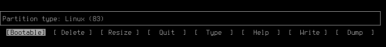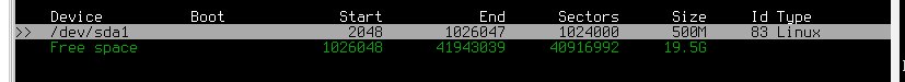 (10)现在你可以设置分区了。使用方向键,选中New,按下回车键并输入500M,你需要将此分区标记为可引导分区,选中bootable选项并按下回车,屏幕上会出现这个*。