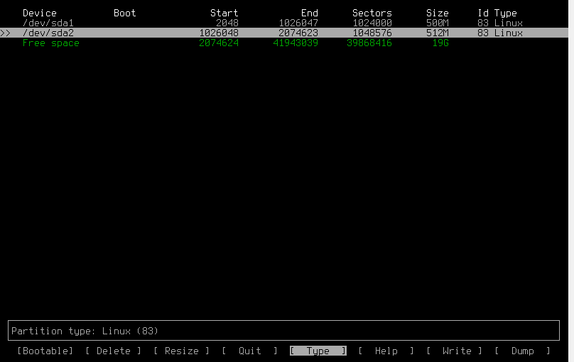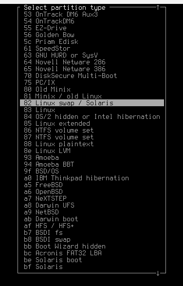 (11)划分swap交换分区,在这个分区里你需要一个不同的文件系统类型。使用方向键选中Type并按下回车。这时将会显示一个列表。 选中Linux swap, solaris并按下回车键。