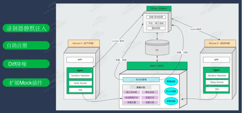 整体架构基于录制回放器的主路复制,设定接口采样率、流量分组等策略,应用端通过挂载注入录制器探针自动注册到服务端形成录制流量回流,平台层向回放器分发流量回放指令,从而形成基本的流量录制回放的闭环,支持Mock回放、自动降燥回放、普通回放三种模式的技术实现。