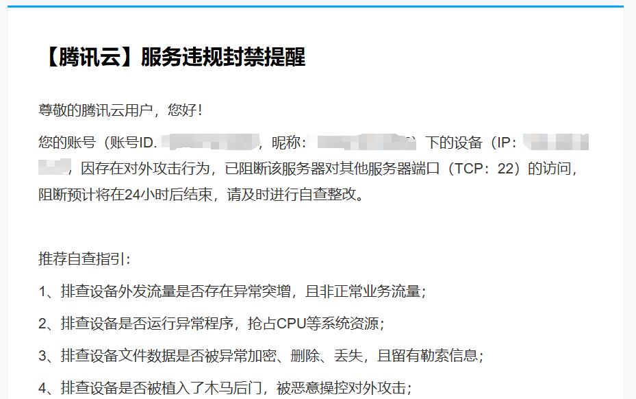 腾讯云违规封禁提醒:服务器存在对外攻击行为