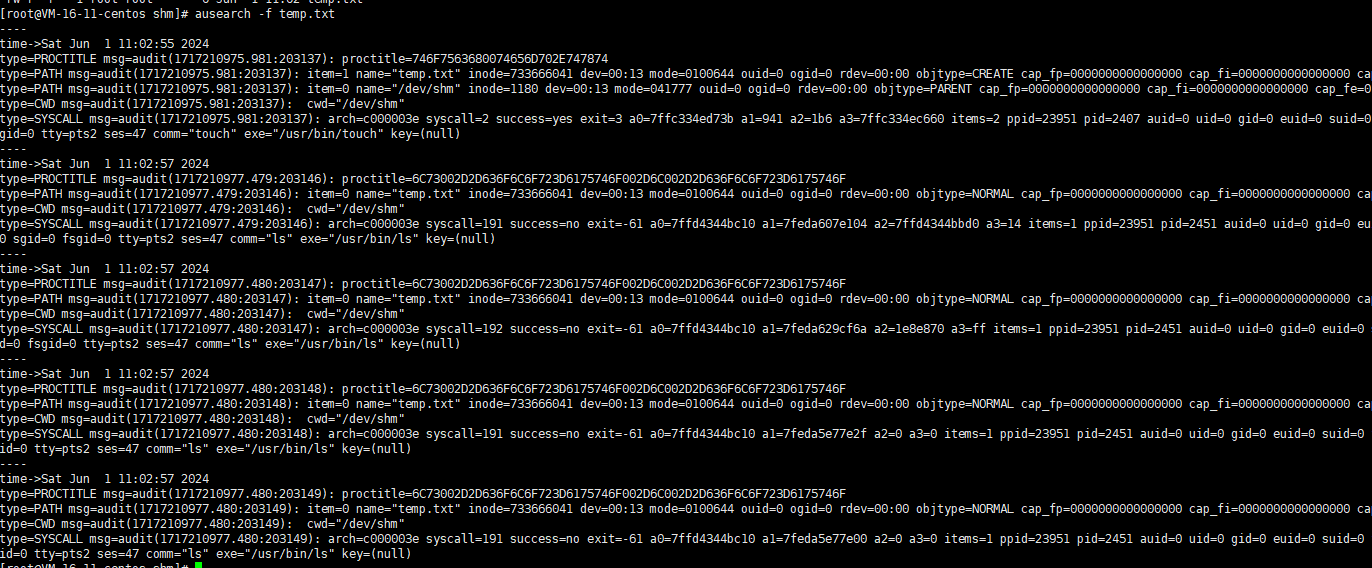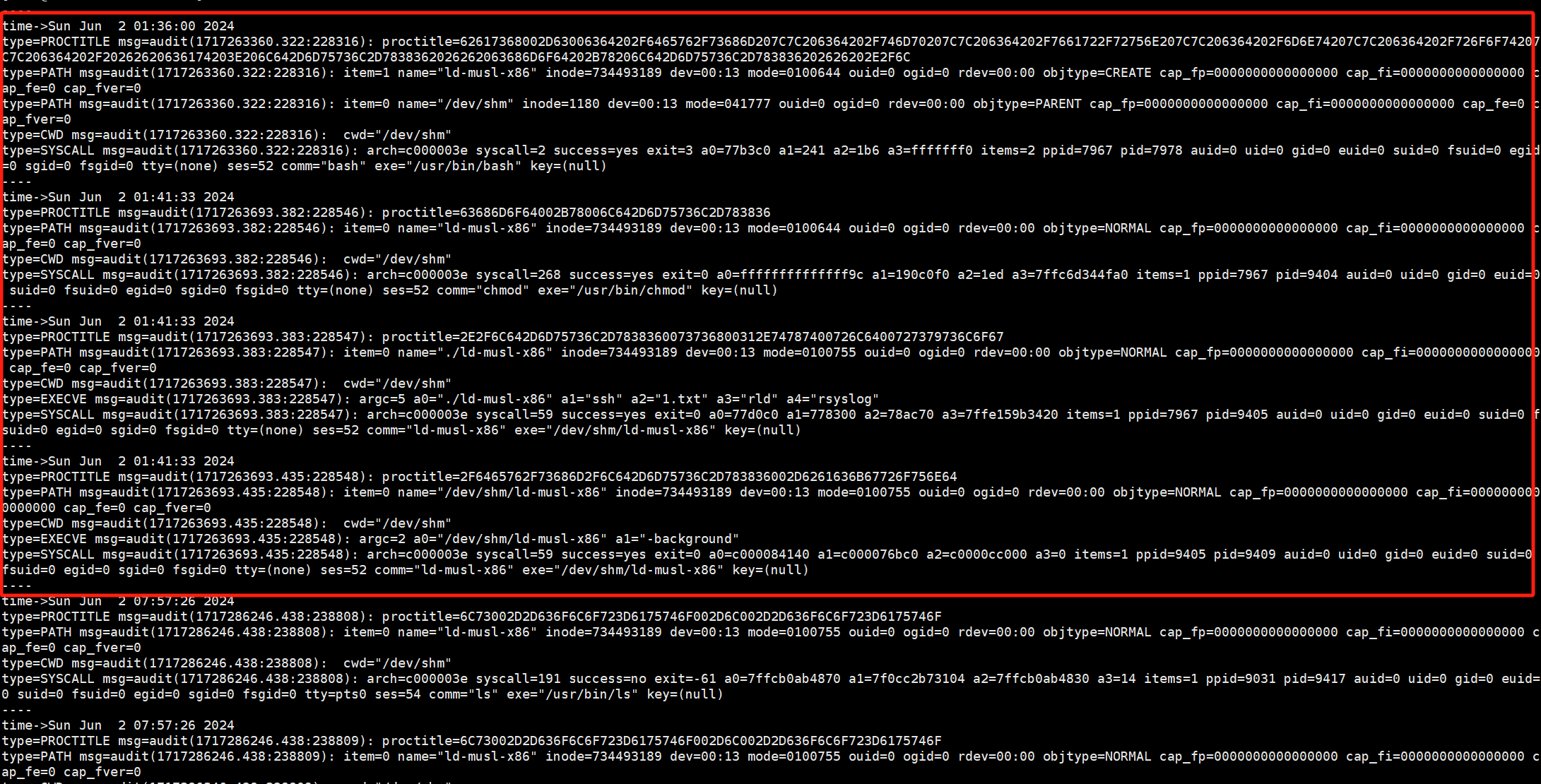 通过 auditctl -w /dev/shm指定要审计的文件目录,如果ld-musl-x86这个文件再次被创建,就可以通过ausearh -f ld-musl-x86查看。