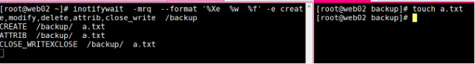 [root@web02 ~]# inotifywait -mrq --format '%Xe %w %f' -e create,modify,delete,attrib,close_write /backup