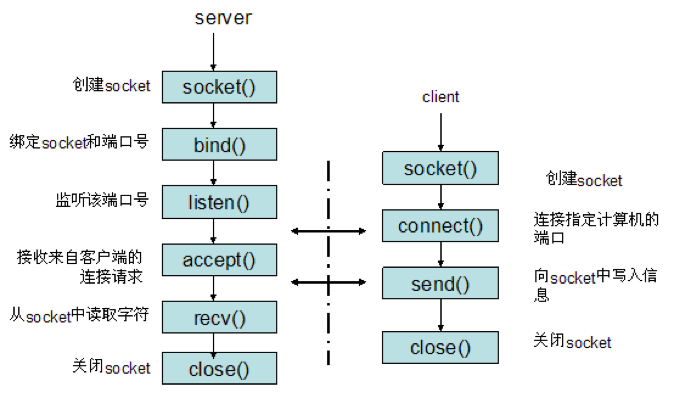可以看到这两个程序就是通过socket api,严格按照服务端和客户端的执行流程来编写的。再次打出socket 客户端和服务端建立连接过程,顺便复习一下。