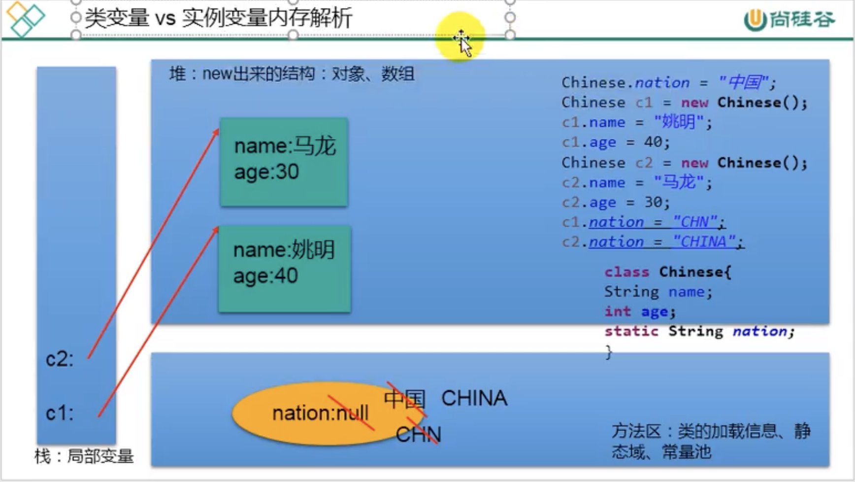 1 public class static1 { 2 public static void main(String[] args) { 3 4 中国人.nation = "汉族"; //可以在实例化对象之前对类中的静态变量进行赋值. 5 6 中国人 c = new 中国人(); 7 c.name = "qqman"; 8 c.age = 22; 9 10 11 中国人 c1 = new 中国人(); 12 c1.name = "u+1"; 13 c1.age = 22; 14 } 15 16 } 17 18 19 20 class 中国人{ 21 String name; 22 int age; 23 static String nation; 24 }