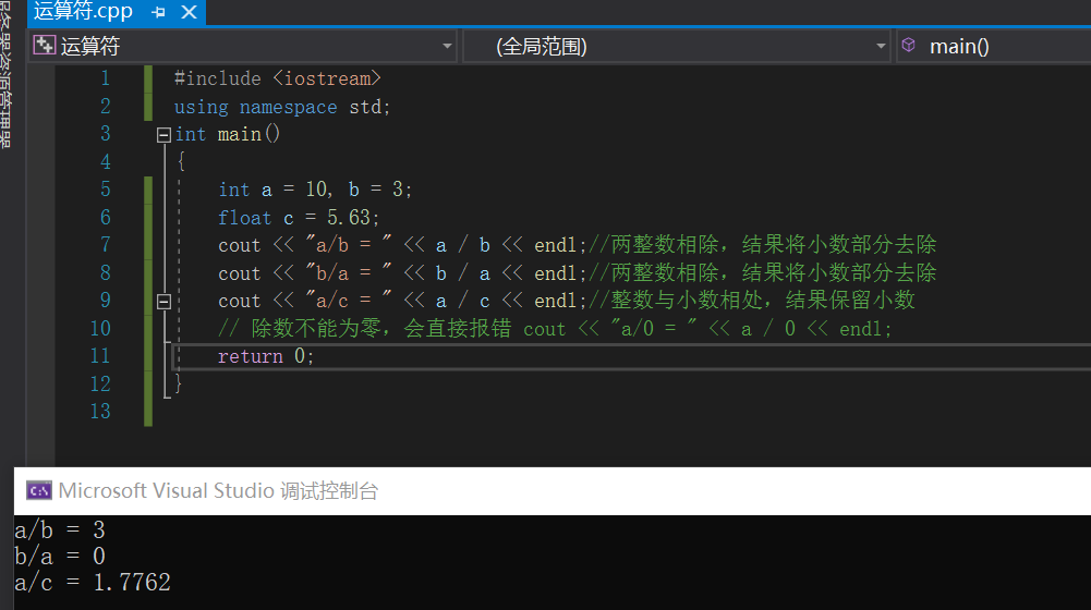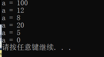 1 #include<iostream> 2 using namespace std; 3 int main() { 4 5 //赋值运算符 6 7 // = 8 int a = 10; 9 a = 100; 10 cout << "a = " << a << endl; 11 12 // += 13 a = 10; 14 a += 2; // a = a + 2; 15 cout << "a = " << a << endl; 16 17 // -= 18 a = 10; 19 a -= 2; // a = a - 2 20 cout << "a = " << a << endl; 21 22 // *= 23 a = 10; 24 a *= 2; // a = a * 2 25 cout << "a = " << a << endl; 26 27 // /= 28 a = 10; 29 a /= 2; // a = a / 2; 30 cout << "a = " << a << endl; 31 32 // %= 33 a = 10; 34 a %= 2; // a = a % 2; 35 cout << "a = " << a << endl; 36 37 system("pause"); 38 39 return 0; 40 }