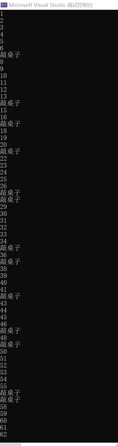 1 #include<iostream> 2 using namespace std; 3 int main() { 4 for (int a = 1; a <= 100; a++) 5 { 6 if (a % 7 == 0) 7 { 8 cout << "敲桌子" << endl; 9 } 10 else if (a % 10 == 7) 11 { 12 13 14 cout << "敲桌子" << endl; 15 16 } 17 else if (a / 10 % 10 == 7) 18 { 19 cout << "敲桌子" << endl; 20 } 21 else 22 cout << a << endl; 23 } 24 return 0; 25 }