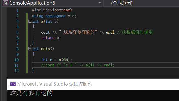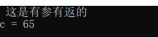 1 #include <iostream> 2 using namespace std; 3 int a(int b ) 4 { 5 cout << " 这是有参有返的" << endl; 6 return b; 7 } 8 int main() 9 { 10 int c = a(65); 11 cout << "c = " << c << endl; 12 }