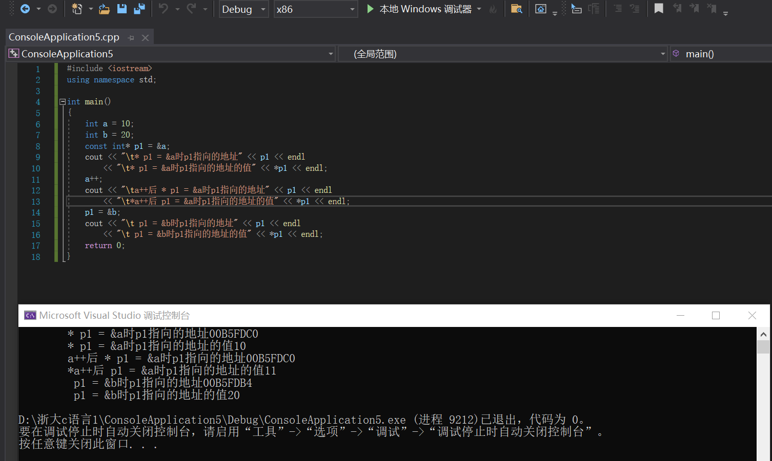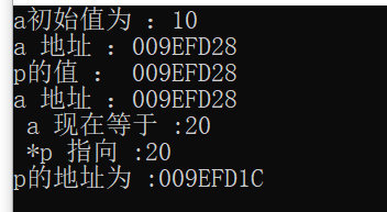 1 #include <iostream> 2 using namespace std; 3 int main() 4 { 5 int a = 10; 6 cout << "a初始值为 :" << a << endl; 7 int* p;//*加变量名代表着这个是一个指针变量 8 p = &a;//&加变量名意味着这个变量的地址,这里我们将a的地址赋值给了p,当然我们也可以在创建指针变量p的时候赋值:int* p = a; 9 cout << "a 地址 :" << &a << endl; 10 cout << "p的值 : " << p << endl;//这里两个的输出值是一样的因为我们已经把&a 赋值给了 p 11 *p = 20; 12 /*因为p通过定义是指针函数,然后又将a的地址赋值给了p,所以p相当于一个找到a的地图, 13 因此我们可以通过*引用p中的地址指向a的值,也就是说*通过p地图找到了a地的宝藏, 14 所以当*拿着地图p时,a地的宝藏也可以说是*的宝藏,*p可以控制a地宝藏的数量 */ 15 cout << " a 现在等于 :" << a << endl; 16 cout << "a 现在地址 :" << &a << endl;//不会因为值改变而改变 17 cout << " *p 指向 :" << *p << endl; 18 cout << "p的地址为 :" << &p << endl;//p虽然承担着地图的功能,但因为它储存了a的地址,所以它本身也有地址 19 return 0; 20 }