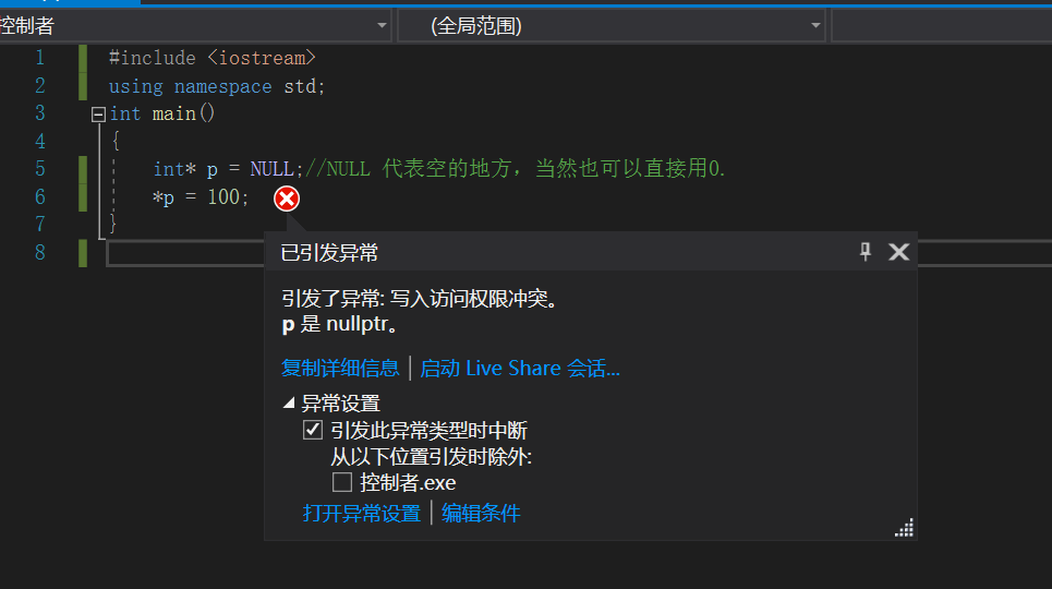 1 int main() { 2 3 //指针变量p指向内存地址编号为0的空间 4 int * p = NULL;//可以用0也是一个意思 5 6 //语法上不会报错,但是运行时会报错.因为空指针不可访问 7 //内存编号0 ~255为系统占用内存,不允许用户访问 8 cout << *p << endl; 9 10 system("pause"); 11 12 return 0; 13 }