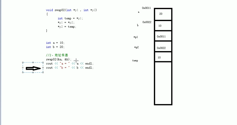 1 #include <iostream> 2 using namespace std; 3 //值传递 4 void swap1(int a ,int b) 5 { 6 int temp = a; 7 a = b; 8 b = temp; 9 } 10 //地址传递 11 void swap2(int * p1, int *p2) 12 { 13 int temp = *p1; 14 *p1 = *p2; 15 *p2 = temp; 16 } 17 18 int main() { 19 20 int a = 10; 21 int b = 20; 22 swap1(a, b); // 值传递不会改变实参 23 24 swap2(&a, &b); //地址传递会改变实参, 25 //因为是赋给形参实参的地址值 ,所以当作指针函数来看,可以改变实参的值 26 27 cout << "a = " << a << endl; 28 29 cout << "b = " << b << endl; 30 31 system("pause"); 32 33 return 0; 34 }