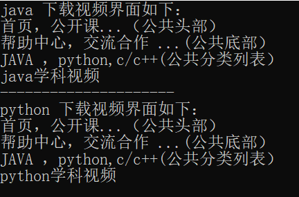 1 #include <iostream> 2 using namespace std; 3 //普通实现 4 //java页面 5 //class java 6 //{ 7 //public: 8 // void header() 9 // { 10 // cout << "首页,公开课...(公共头部)" << endl; 11 // } 12 // void footer() 13 // { 14 // cout << "帮助中心,交流合作 ...(公共底部)" << endl; 15 // } 16 // void left() 17 // { 18 // cout << "JAVA ,python,c/c++(公共分类列表)" << endl; 19 // } 20 //void content() 21 //{ 22 // cout << "java学科视频" << endl; 23 //} 24 //}; 25 ////python页面 26 //class python 27 //{ 28 //public: 29 // void header() 30 // { 31 // cout << "首页,公开课...(公共头部)" << endl; 32 // } 33 // void footer() 34 // { 35 // cout << "帮助中心,交流合作 ...(公共底部)" << endl; 36 // } 37 // void left() 38 // { 39 // cout << "JAVA ,python,c/c++(公共分类列表)" << endl; 40 // } 41 // void content() 42 // { 43 // cout << "python学科视频" << endl; 44 // } 45 //}; 46 47 //继承实现页面 48 //继承好处:减少重复代码 49 //语法 : class 子类(派生类) :继承方式 父类(基类) 50 class basepage //公共信息 51 { 52 public: 53 void header() 54 { 55 cout << "首页,公开课...(公共头部)" << endl; 56 } 57 void footer() 58 { 59 cout << "帮助中心,交流合作 ...(公共底部)" << endl; 60 } 61 void left() 62 { 63 cout << "JAVA ,python,c/c++(公共分类列表)" << endl; 64 } 65 }; 66 class java : public basepage 67 { 68 public: 69 void content() 70 { 71 cout << "java学科视频" << endl; 72 } 73 }; 74 class python : public basepage 75 { 76 public: 77 void content() 78 { 79 cout << "python学科视频" << endl; 80 } 81 }; 82 void test01() 83 { 84 cout << "java 下载视频界面如下:" << endl; 85 java ja; 86 ja.header(); 87 ja.footer(); 88 ja.left(); 89 ja.content(); 90 cout << "---------------------" << endl; 91 cout << "python 下载视频界面如下:" << endl; 92 python py; 93 py.header(); 94 py.footer(); 95 py.left(); 96 py.content(); 97 98 } 99 int main() 100 { 101 test01(); 102 }