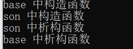 1 #include <iostream> 2 using namespace std; 3 // 继承中构造和析构顺序 4 class base 5 { 6 public: 7 base() 8 { 9 cout << "base 中构造函数" << endl; 10 } 11 ~base() 12 { 13 cout << "base 中析构函数" << endl; 14 } 15 }; 16 class son :public base 17 { 18 public: 19 son() 20 { 21 cout << "son 中构造函数" << endl; 22 } 23 ~son() 24 { 25 cout << "son 中析构函数" << endl; 26 } 27 }; 28 void test01() 29 { 30 //继承中的构造与析构顺序如下 31 //继承中 先调用父类构造函数,再调用子类构造函数,析构顺序与构造相反 32 //base b; 33 son so; 34 } 35 int main() 36 { 37 test01(); 38 }