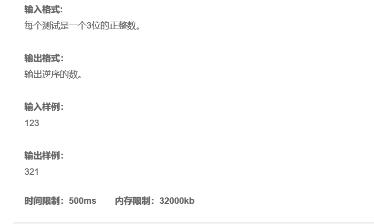 程序每次读入一个正三位数,然后输出逆序的数字。注意,当输入的数字含有结尾的0时,输出不应带有前导的0。比如输入700,输出应该是7。