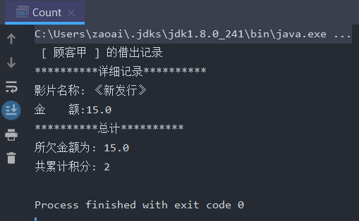 public static void main(String[] args) { Movie movie = new Movie("《新发行》", Movie.NEW_RELEASE); Rental rental = new Rental(movie, 5); Customer customer = new Customer("顾客甲"); customer.addRental(rental); System.out.println(customer.statement()); }